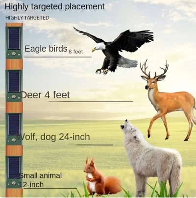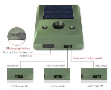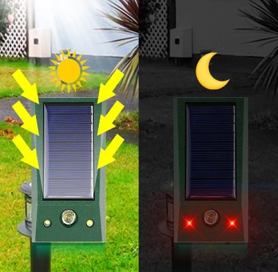 יכול להרחיק ביעילות ציפורים ומזיקים על ידי פליטת גלים קוליים חזקים ונורות מהבהבות LED חזקות.